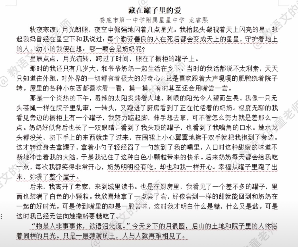 这篇作文的作者,是娄底市第一中学附属星星中学初三男生龙睿熙。上星期,语文老师童老师布置了一篇“藏在……里的爱”的半命题作文,龙睿熙这篇《藏在罐子里的爱》让她热泪盈眶。在征得同意后,11月5日,童老师在自己的社交平台账号上,分享了这篇作文。