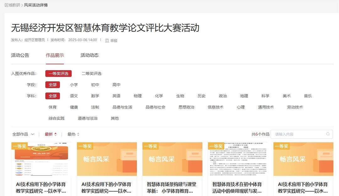 此外,平台还为教研成果展示与转化提供了数字化阵地,通过各类评比活动激发教师教研创新的内生动力。如智慧体育教学论文评比、个性化手册优秀案例评选等,都借助平台实现了成果的广泛征集与高效筛选,部分优质作品被纳入区域资源库进行推广。这种“活动搭台、成果共享”的模式,让个体教研智慧转化为区域教育合力,推动教研质量整体提升。